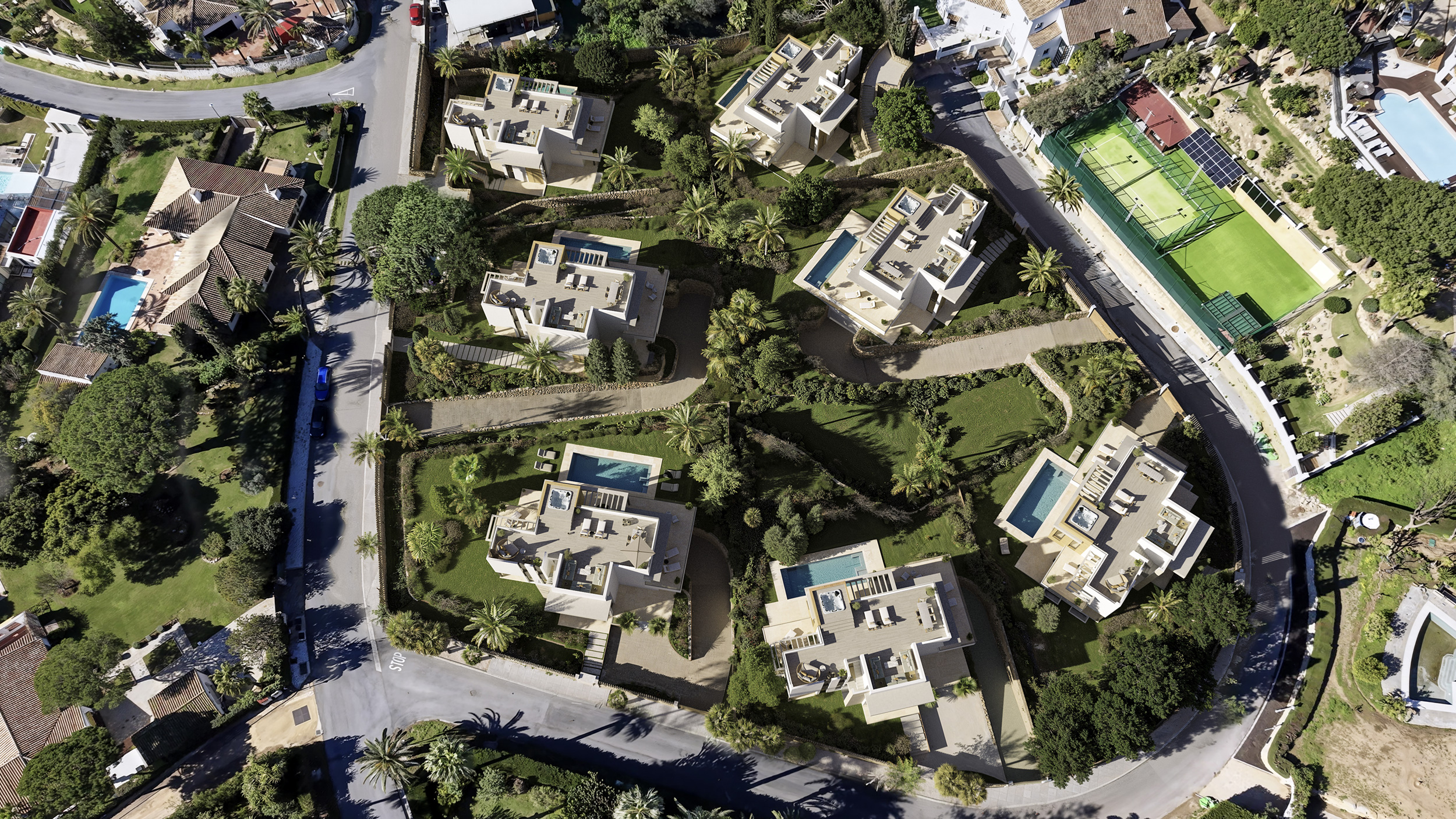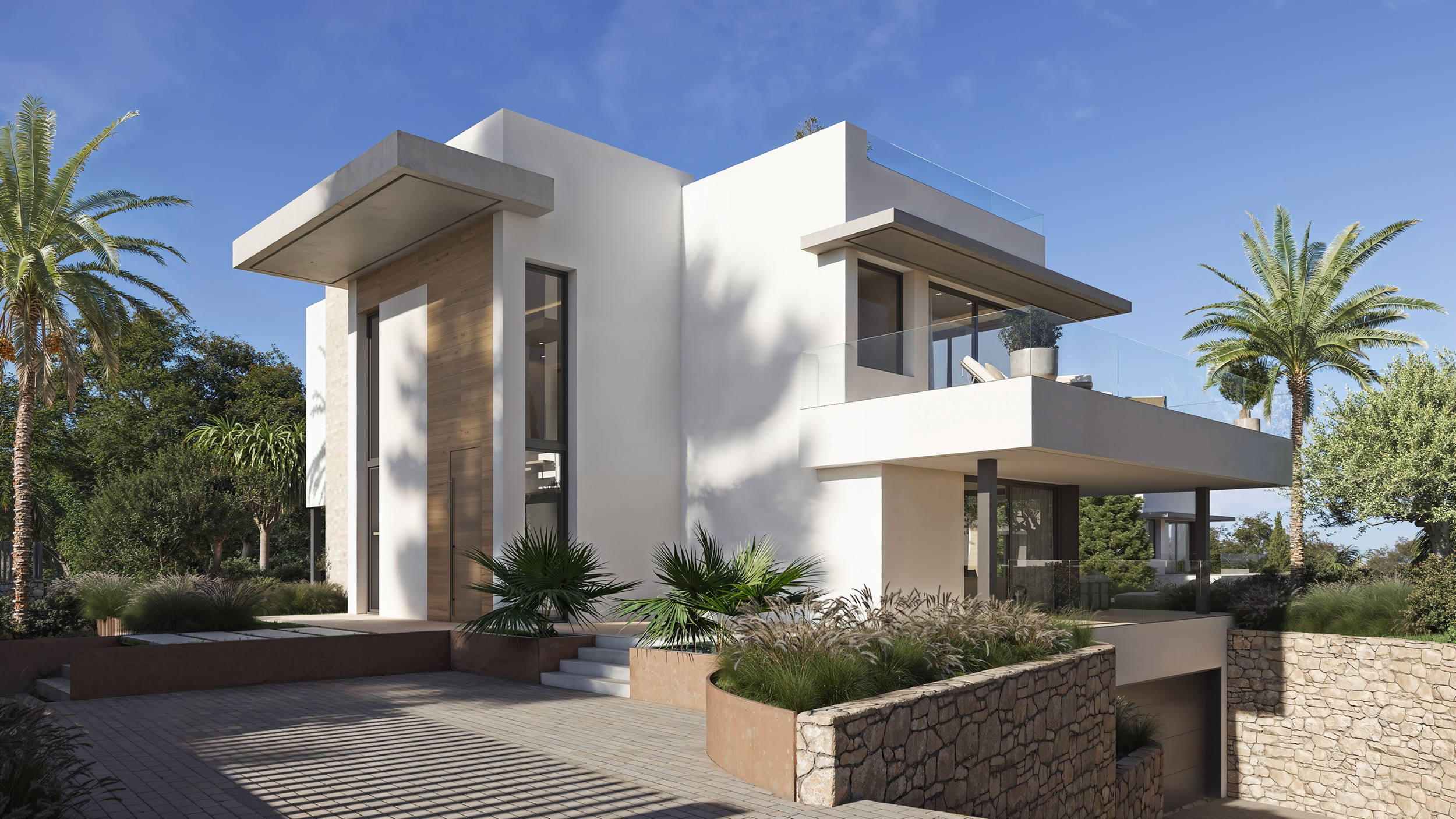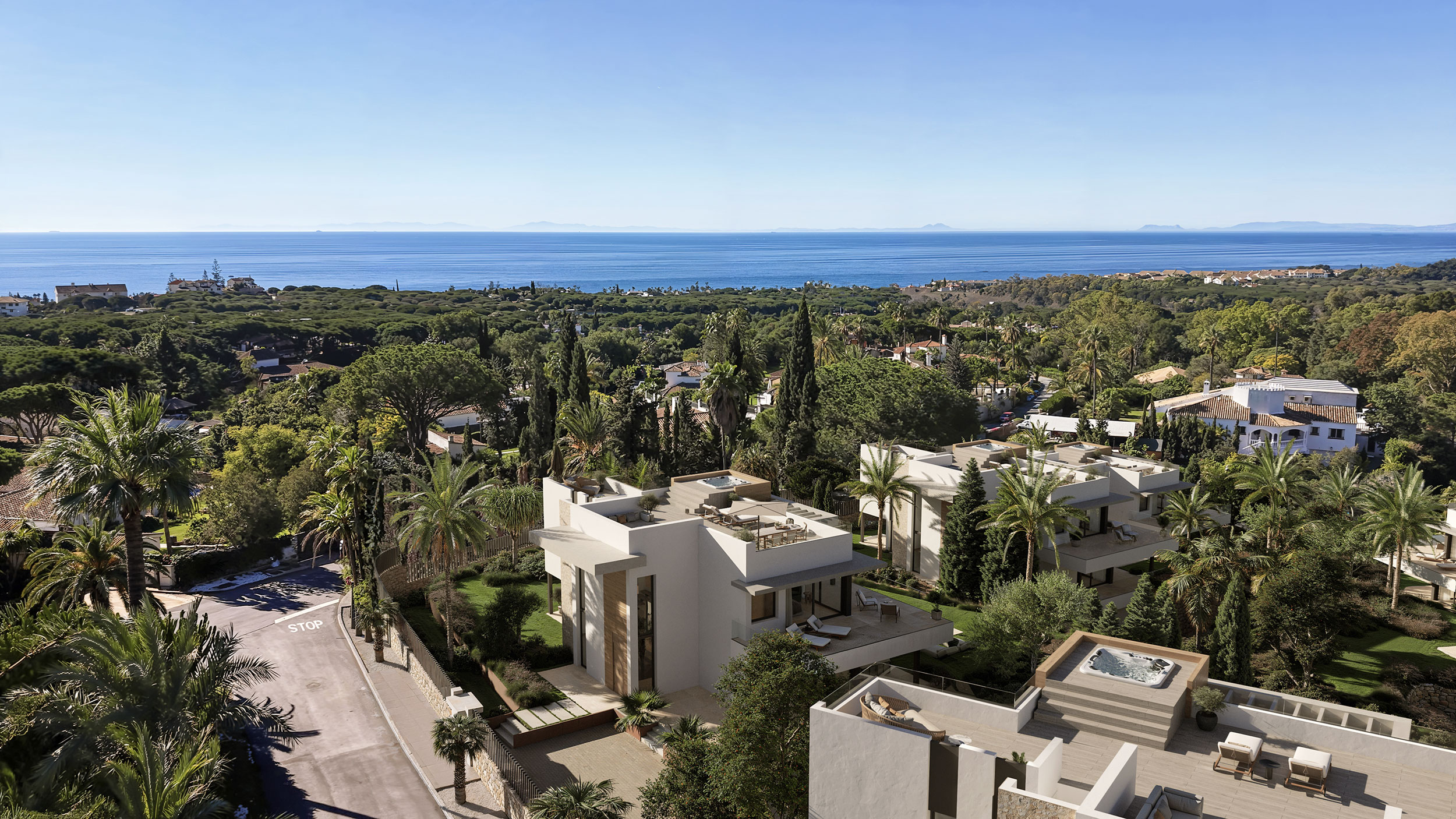 El diseño exterior de cada villa ha sido concebido como una extensión natural del interior, donde el lujo se expresa en forma de espacio, vistas y libertad. El solárium, donde destaca un jacuzzi panorámico, se convierte en un escenario privilegiado para el descanso y la contemplación. Desde este nivel elevado, la mirada se abre hacia el mar y los jardines, creando una absoluta armonía con el entorno. Un espacio pensado para disfrutar de la luz, de la brisa y del tiempo propio.