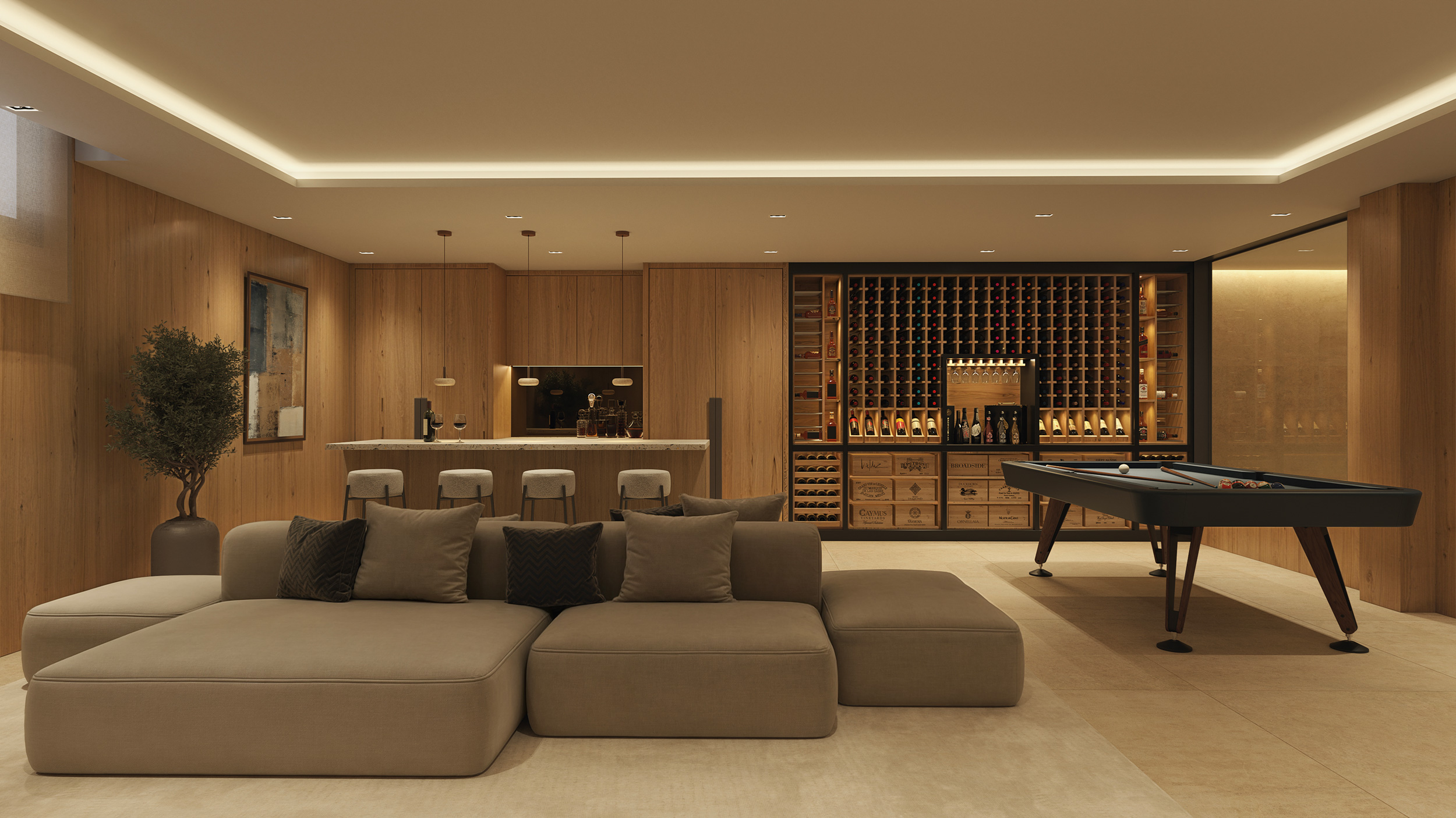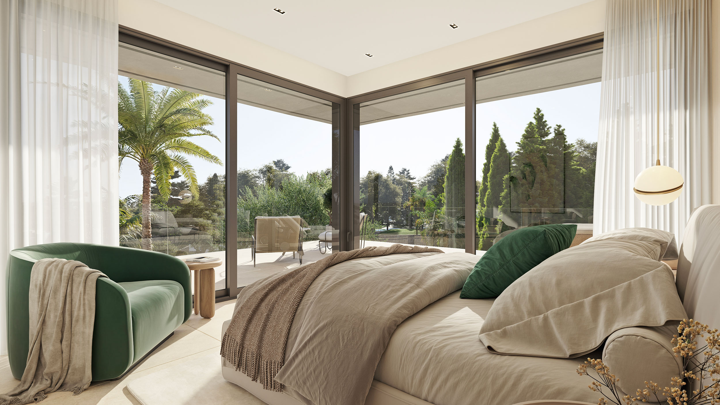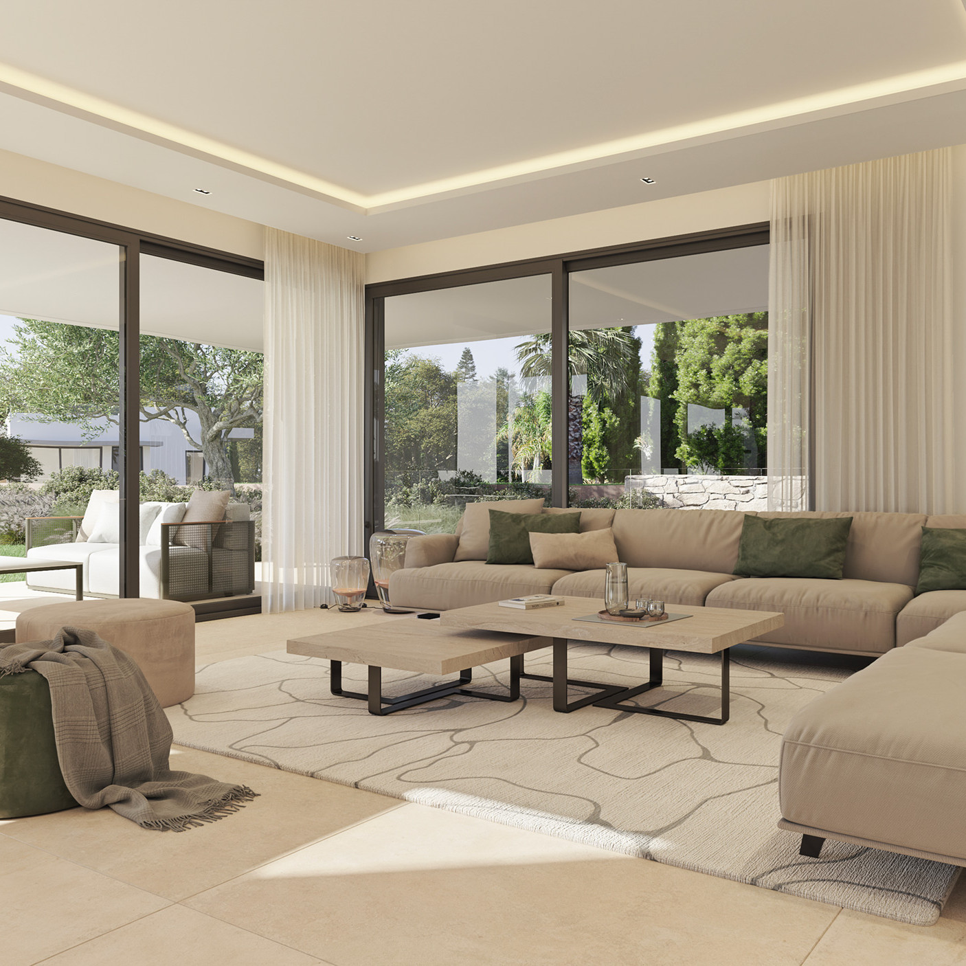 La conexión directa con terrazas y jardines crea una continuidad espacial que diluye los límites entre interior y exterior, elevando la experiencia residencial. Este salón no solo acoge, impresiona. Es el centro social de la villa, diseñado para reflejar un estilo de vida sofisticado y contemporáneo.