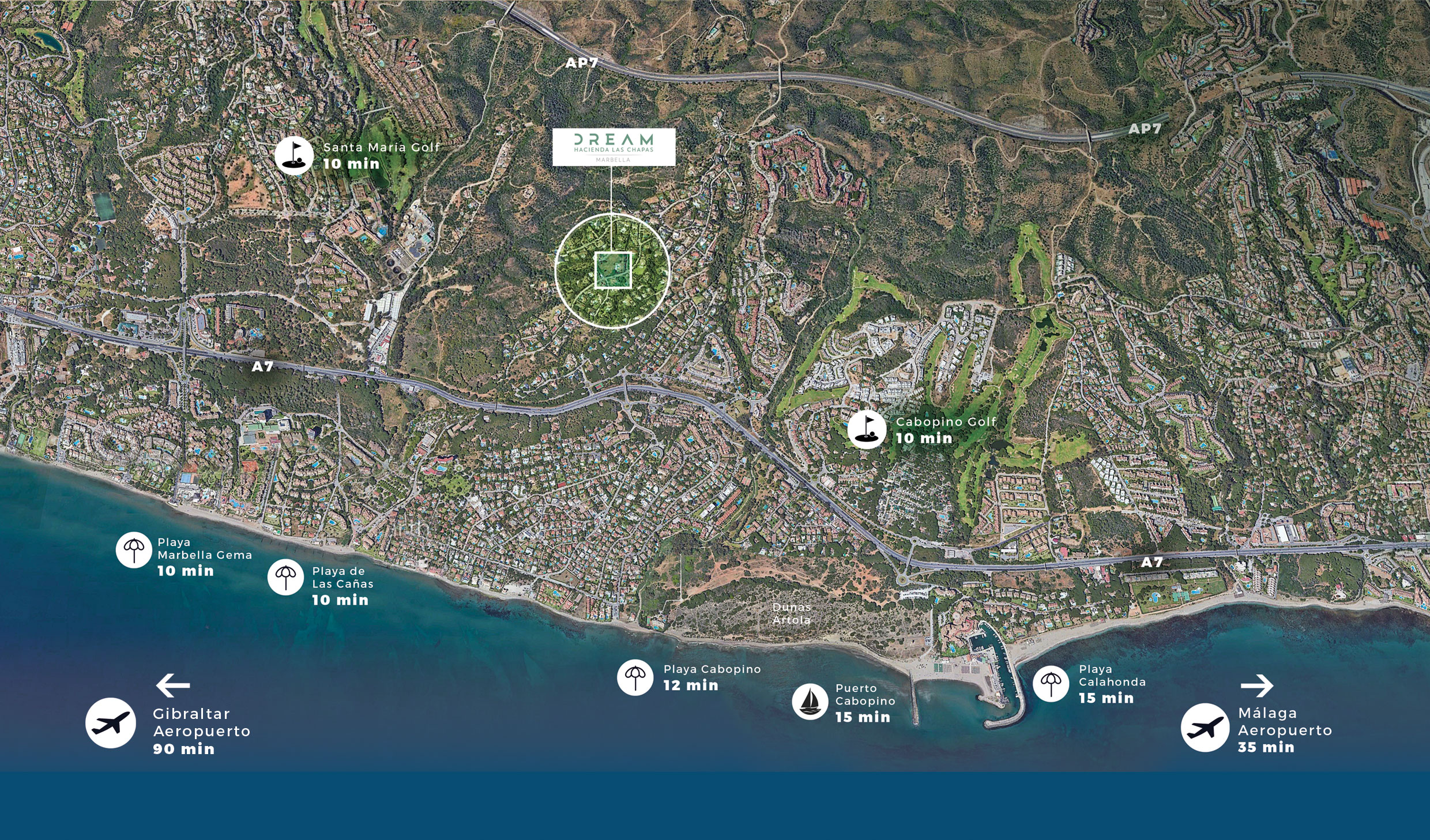 Dream Hacienda Las Chapas se ubica sobre una de las últimas parcelas disponibles en esta prestigiosa zona de Marbella, un factor de exclusividad que consolida su valor presente y futuro. Su ubicación ofrece una conectividad impecable: a escasos minutos del centro y de Puerto Banús, con acceso directo al aeropuerto internacional, campos de golf de primer nivel, hospitales privados de prestigio y todos los servicios esenciales y de la más alta exigencia.